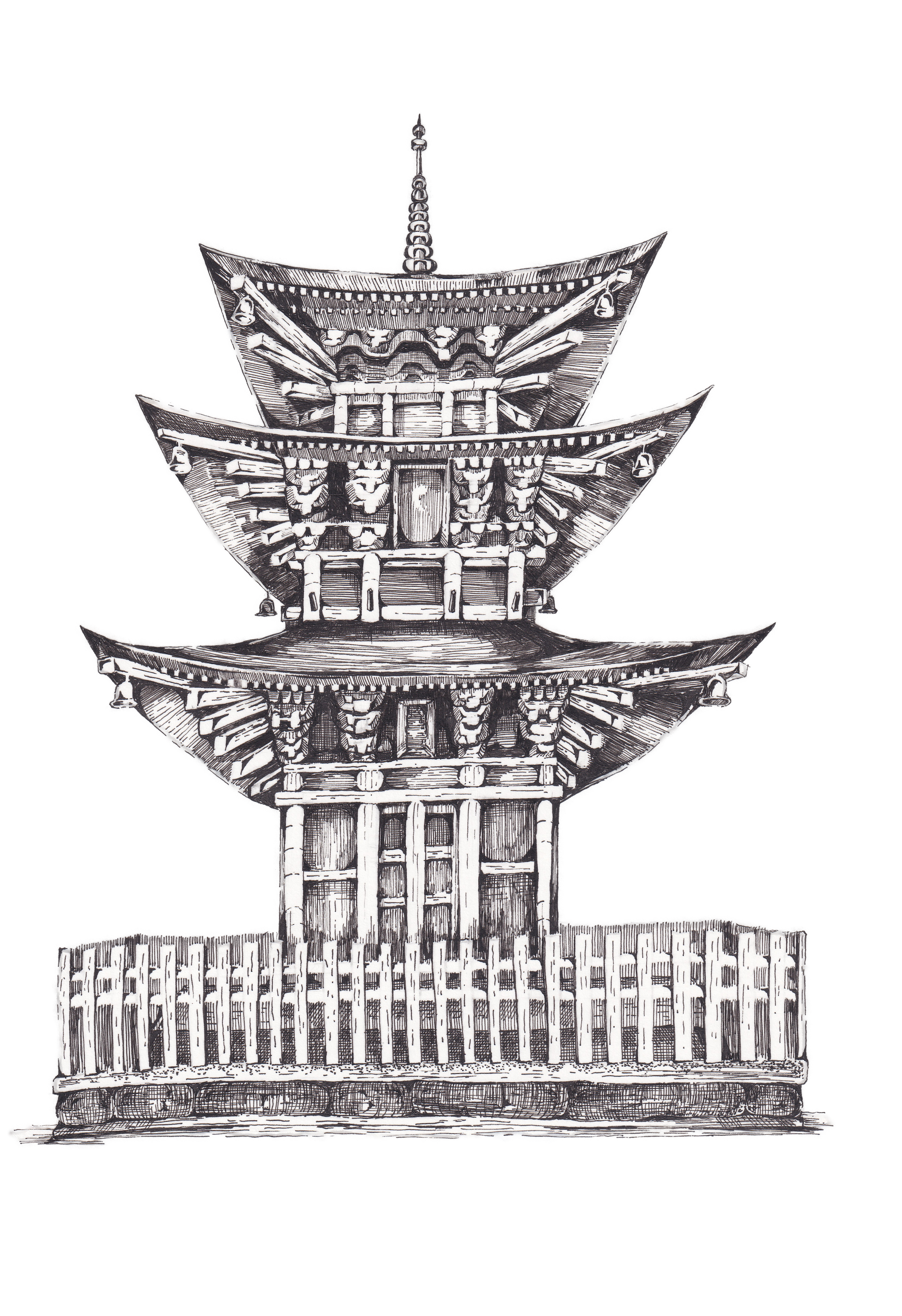 三重塔の手描き線画イラスト
